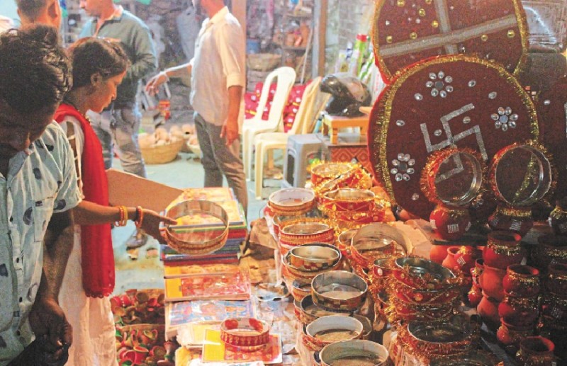 पति की दीर्घायु के लिए मनाए जाने वाले करवाचौथ पर्व को लेकर बाजार सज चुका है। पूजन एवं शृंगार के दुकानों पर महिलाएं श्रृंगार, व्रत व पूजन से जुड़े सामानों की खरीदारी करते हुए देखी जा रही हैं। करवा चौथ पूजन के लिए मिट्टी के करवा, छलनी, कलैंडर व अन्य पूजन सामग्री की भी खूब बिक्री हो रही है। पुष्प बाजार में भी बहार है। दुकानदार भी सामानों की बिक्री से खुश नजर आ रहे हैं।