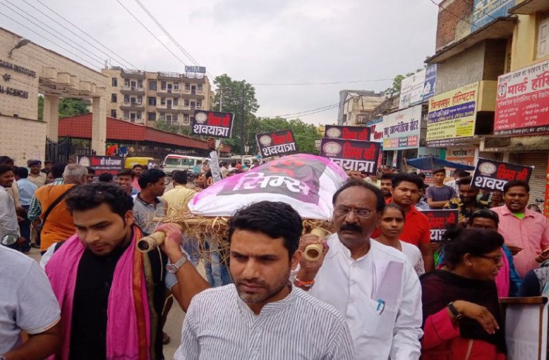 बिलासपुर। गुरुवार को शहर के जोगी कांग्रेस (jogi congress chhattisgarh) समर्थकों और कार्यकर्ताओं द्वारा (jogi congress party) सिम्स हॉस्पिटल (cims hospital bilaspur) की शव यात्रा निकाली गई। जोगी कांग्रेस समर्थकों ने सिम्स (cims bilaspur review) के शव को लेकर शहर में शव यात्रा निकाली और आखिर में शहर के मध्य स्थित अरपा नदी में उसका अंतिम संस्कार कर दिया। (funeral procession)