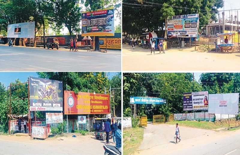 अरपापारा एसईसीएल मुख्यालय के सामने रसूखदारों ने सड़क किनारे दो बड़े होर्डिंग्स लगा रखे हैं। इसके साथ ही गुरु घासीदास सेंट्रल यूनिवर्सिटी मोड़ पर तीन अवैध होर्डिंग्स लगाए गए हैं। ये अवैध होर्डिंग्स पिछले कई वर्षों से लगाए गए हैं। अभी तक इसके खिलाफ कार्रवाई नहीं की गई।