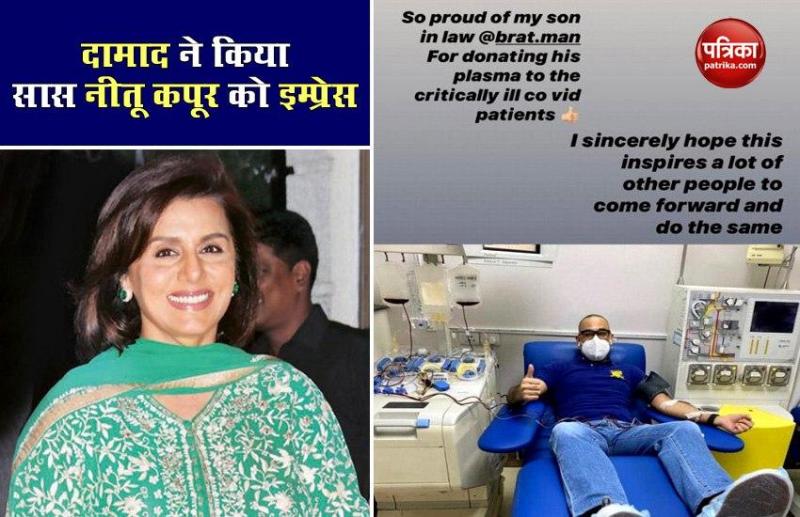 दरअसल, कुछ समय पहले नीतू के दमाद और रिद्धिमा कपूर साहनी ( Riddhima Kapoor Sahani husband ) के पति भरत साहनी ने COVID-19 के लिए प्लाज्मा दान किया ( Bharat Sahni donated plasma ) है ताकि इससे पीड़ित रोगियों का इलाज हो सके। नीतू कपूर ने अपने इंस्टाग्राम ( Neetu kapoor instagram ) पर भरत साहनी को लेकर लिखा, 'उन्हें उनके दामाद भरत साहनी पर गर्व है । गंभीर रूप से बीमार कोविड मरीजों को अपने प्लाज्मा दान करने के लिए...। उन्हें पूरी उम्मीद है कि यह बहुत से लोगों को आगे आने और ऐसा ही करने के लिए प्रेरित करेगा।' सास से तारीफ सुनने के बाद उनकी पत्नी भी पति के इस काम की तारीफ करने के लिए खुद को रोक ना पाईं और रिद्धिमा कपूर साहनी ( Riddhima Shared photo with husband and daughter ) ने भी पति का ये स्टेप देखने के बाद बेटी समाइरा साहनी के साथ एक फोटो शेयर की है । इसमें उन्होंने लिखा, 'आप पर गर्व है कि आपने प्लाज्मा डोनेशन ( Plasma donation ) जैसा अच्छा काम किया। ताकि लोगों की जिंदगी सुरक्षित हो सके । बहुत खूब।'