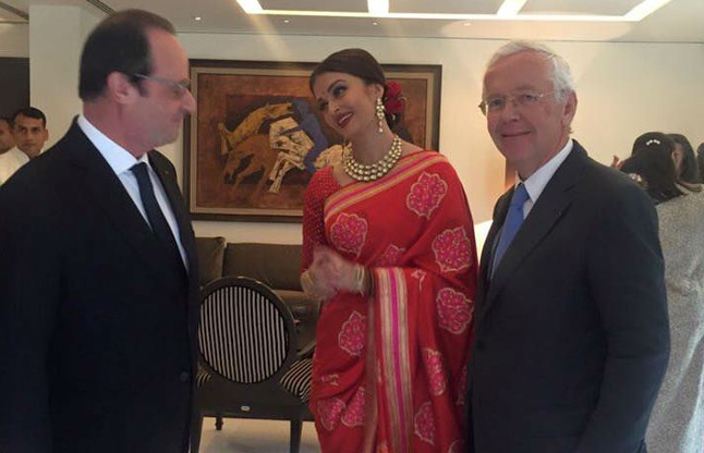 नई दिल्ली। बॉलीवुड अभिनेत्री और पूर्व 'विश्व सुंदरी' ऐश्वर्या राय बच्चन मंगलवार को फ्रांस के राष्ट्रपति फा्रंस्वा ओलांद के साथ दोपहर के खास भोज में शामिल हुईं और उनका यह अनुभव काफी अच्छा रहा। लाल रंग की डिजाइनर बनारसी सिल्क की साड़ी में ऐश्वर्या बेहद आकर्षक दिख रही थीं और सभी के लिए आकर्षण का केंद्र भी थीं।