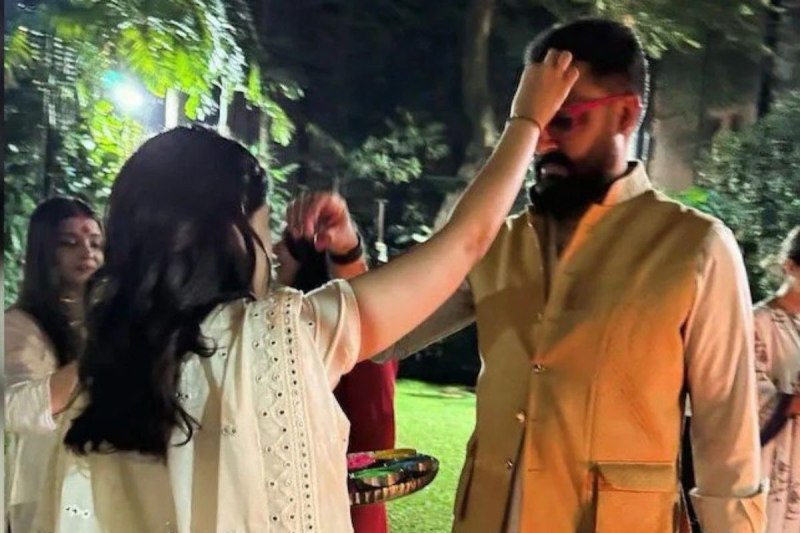 ऐश्वर्या राय बच्चन परिवार के साथ रविवार को होलिका दहन पूजा में शामिल हुई। ऐसे में एक्ट्रेस की एक फोटो वायरल हो रही है, इसमें ऐश्वर्या ने अपनी मांग में काफी गाढ़ा सिंदूर लगाया हुआ है। वहीं, उनके सामने अभिषेक बच्चन को नव्या नवेली नंदा रंग लगा रही हैं जो लग रहा है कि उन दोनों की फोटो ऐश्वर्या ही क्लीक कर रही हों। इस फोटो में ऐश्वर्या का अंदाज काफी अलग लग रहा है, वह काफी सुंदर नजर आ रही हैं।