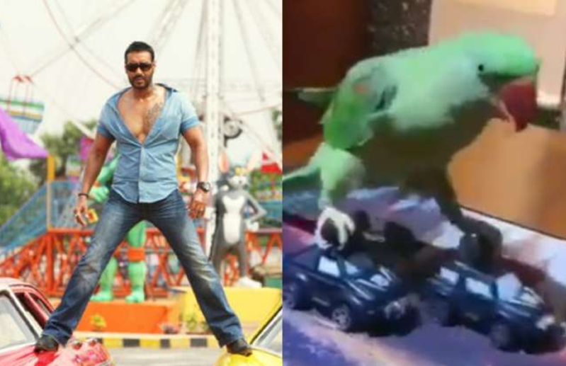 बॉलीवुड के कई ऐसे स्टार्स ऐसे हैं जो फिल्मों में खतरनाक स्टंट करते हैं। अभिनेता अजय देवगन भी इसी लिस्ट में शामिल हैं। बता दें कि अजय ने अपने फिल्मी कॅरियर की शुरुआत एक्शन हीरो के रूप में की थी। आपको याद होगा कि उन्होंने अपनी डेब्यू फिल्म 'फूल और कांटे' में मोटरसाइकिल का एक स्टंट किया था। वे दो बाइक्स पर खड़े होकर आते हैं। लेकिन आपको जानकर आश्चर्य होगा कि एक तोता अजय देवगन के खतरनाक स्टंट की नकल करता है 'गोलमाल सीरीज की फ़िल्मों में भी अजय मोटरसाइकिल और कारों के साथ ऐसे दृश्य करते रहे हैं।