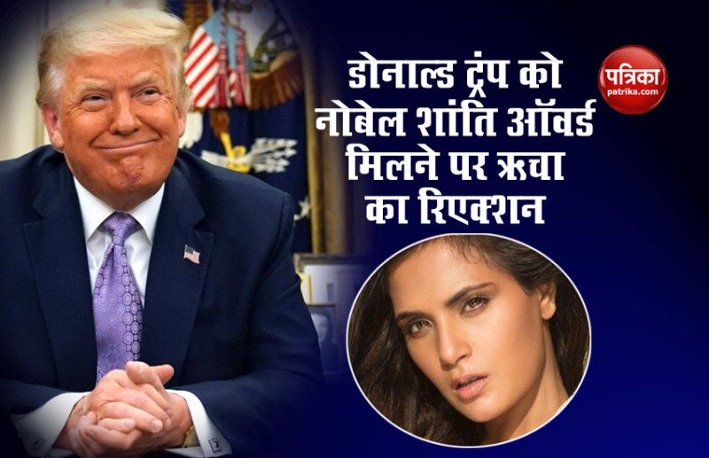 नई दिल्ली। अमेरिकी राष्ट्रपति डोनाल्ड ट्रंप को नोबेल के शांति पुरस्कार के लिए नॉमिनेट किया गया है। इस बात चर्चा आज पूरे विश्व में हो रही है। सोशल मीडिया पर भी सभी अलग-अलग अंदाज इस खबर पर अपने रिएक्शन साझा कर रहे हैं। बॉलीवुड और हॉलीवुड की तरफ से भी रिएक्शन देखने को मिल रहे हैं। हाल ही में बॉलीवुड एक्ट्रेस ऋचा चड्ढा ने अपना रिएक्शन साझा किया है। उन्होंने एक मीम वीडियो शेयर किया है। जिसे देखने के बाद लोगों की हंसी रोकने का नाम नहीं ले रही है। यूजर्स भी बड़े फनी अंदाज में कमेंट करते हुए नज़र आ रहे हैं।