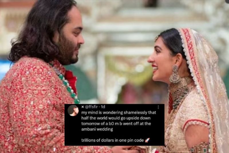 अनंत अंबानी और राधिका मर्चेंट की शादी के बीच इस एक्स यूजर ने एक पोस्ट शेयर किया। इसमें यूजर ने लिखा, 'मेरे दिमाग में एक ख्याल आया है कि अगर अंबानी की शादी में बम फट गया तो आधी दुनिया उलट जाएगी। एक पिन कोड में अरबों-खरबों खत्म।' यूजर के इस पोस्ट के संज्ञान में आने के बाद मुंबई पुलिस उनकी तलाश में जुट गई है। साथ ही पुलिस ने उन इलाकों के आसपास की सुरक्षा भी बढ़ा दी है, जहां अनंत और राधिका की शादी से जुड़े सभी फंक्शन हो रहे हैं।