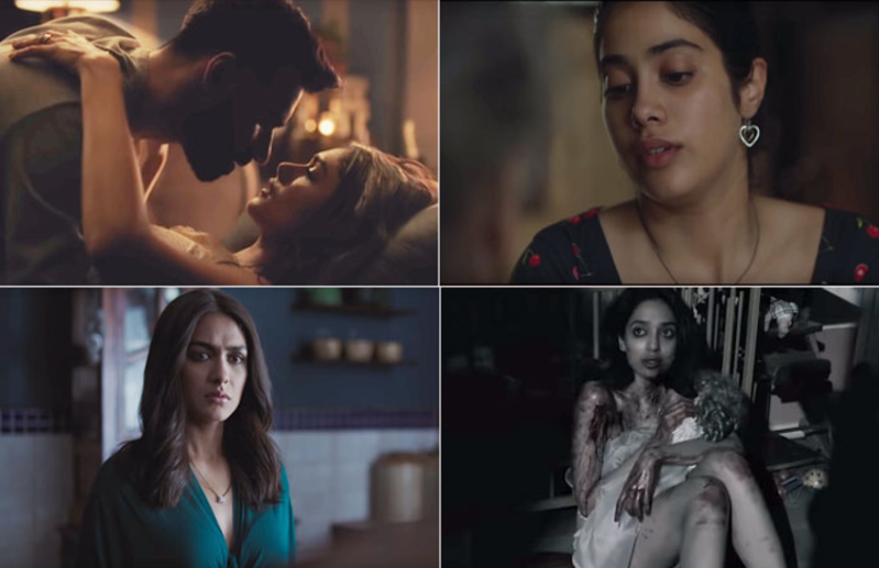 बॉलीवुड अभिनेत्री जाह्नवी कपूर की पहली नेटफ्लिक्स फिल्म घोस्ट स्टोरीज का ट्रेलर शुक्रवार को रिलीज हो गया। इसमें हर वह बात है जो डर के मारे रोंगटे खड़े कर सकती है। इसमें दर्शकों को चार अलग-अलग शॉर्ट फिल्म देखने को मिलेंगी। यह सोशल मीडिया पर धूम मचा रहा है और दर्शक भी खूब पसंद कर रहे है। इसमें जाह्नवी को अलग ही अंदाज देखने मिलेगा। 'घोस्ट स्टोरीज' को जोया अख्तर के साथ बॉलीवुड डायरेक्टर करण जौहर, जोया अख्तर, अनुराग कश्यप और दिबाकर बनर्जी ने निर्देशित किया है।