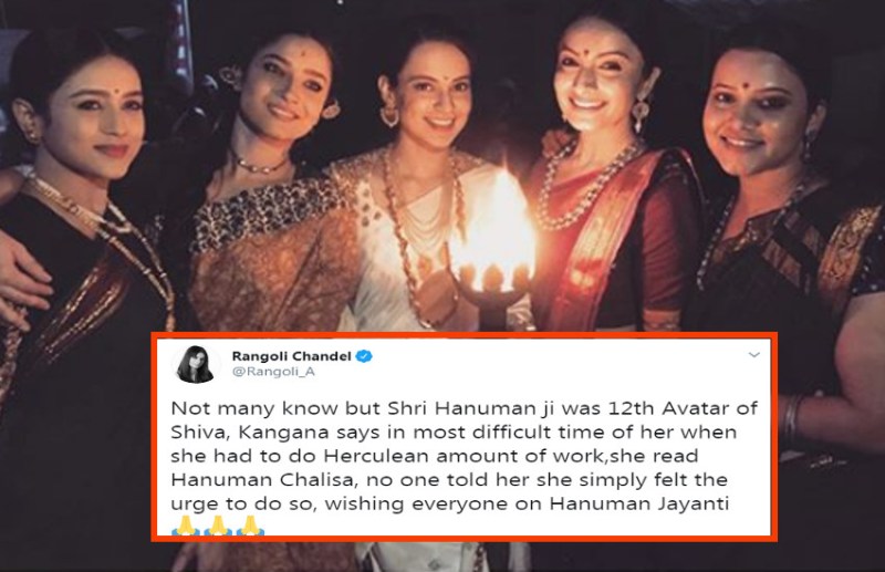 उनका दावा है कि कंगना रानौत हनुमान चालीसा का पाठ करती हैं। कंगना की बहन रंगोली चंदेल ने सोशल मीडिया साइट पर ट्वीट कर बताया कि एक्ट्रेस हनुमान चालिसा का पाठ करती हैं। रंगोली के अनुसार, जब काम के बोझ के चलते उनको मुश्किल आती है, तो वह हनुमान चालिसा पढ़ती हैं। ऐसा करने के लिए उन्हें किसी ने नहीं कहा, वह स्वप्रेरणा से ऐसा करती हैं। सभी को हनुमान जयंती की शुभकामनाएं।