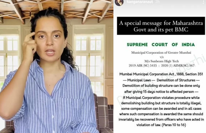बॉलीवुड अभिनेत्री कंगना रनौत ( Kangana Ranut ) और महाराष्ट्र सरकार ( Maharashtra government ) के बीच पिछले कुछ समय से गहरा विवाद चल रहा है। हाल ही कंगना ने महाराष्ट्र सरकार और बृहन्मुंबई महानगर पालिका (बीएमसी BMC) के नाम एक खास संदेश लिखा और अपने इस नोट में उन्हें बीएमसी को राज्य सरकार का पालतू कहकर बुलाया। कंगना ने अपने इंस्टाग्राम स्टोरीज में इमारतों को नुकसान पहुंचाने के संबंध में मुंबई नगर निगम अधिनियम 1888 की धारा 351 में उल्लेखित नियमों का जिक्र किया।
