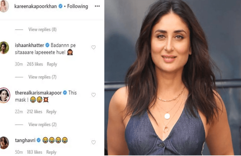 करीना की इस फोटो को देखकर शाहिद कपूर के भाई ईशान खट्टर भी खुद को रोक नहीं पाएं और एक कमेंट कर दिया। इस फोटो में करीना एक फेस मास्क में नजर आ रही है, जिस पर स्टार बने हैं। इसके कैप्शन में उन्होंने लिखा, ऐसा स्टार, मेरा मतलब है मास्क। कैप्शन में वह मास्क के प्रिंट की तरफ इशारा कर रही हैं।