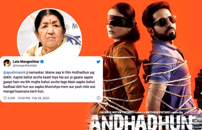 लता मंगेशकर को उनकी फिल्म इतनी पंसद आई कि उन्होंने आयुष्मान के लिए एक ट्वीट किया। उस ट्वीट में उन्होंने लिखा- "आयुष्मान खुराना जी नमस्कार! मैंने आपकी फिल्म 'अंधाधुंध' ( Andhadhun ) आज देखी। आप ने बहुत अच्छा काम किया है और जो भी गाने आप ने गाएं है वो भी मुझे बहुत अच्छे लगे। मैं आपको बधाई देती हूं और आपको भविष्य में बहुत यश मिले ऐसी मंगल कामना करती हूं।" इस ट्वीट को पढ़ आयुष्मान खुराना ने रिप्लाई करते हुए कहा- "लता दी आपका ये कहना मेरे लिए बहुत मायने रखता है। आपके इस प्रोत्साहन के लिए ही शायद मैंने इतनी मेहनत की थी। आर्शीवाद के लिए शुक्रिया।"