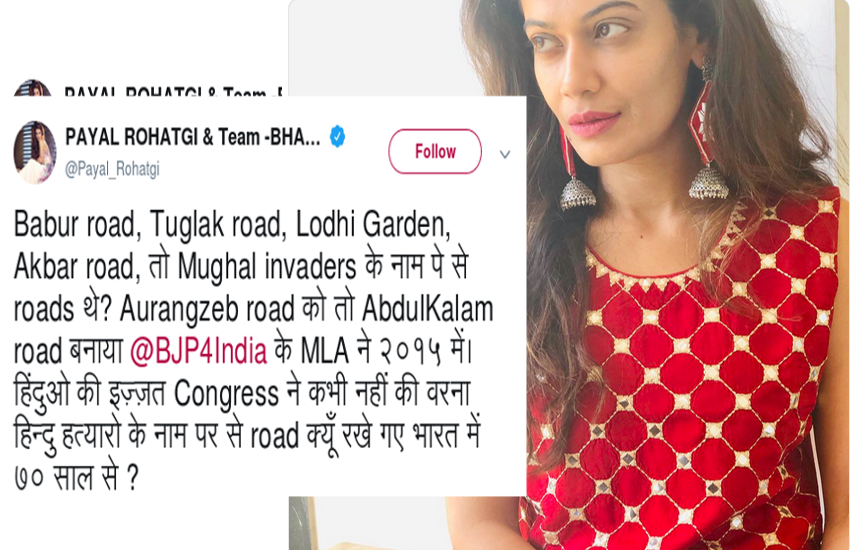 पायल रस्तोगी ने गुरुवार को अपने ट्विस्टर अकाउंट से कांग्रेस तीखा हमला बोला। एक्ट्रेस ने लिखा है कि कांग्रेस ने 70 साल से हिंदुओं की कोई इज्जत नहीं की। उन्होंने कहा, पहले बाबर रोड, तुगलक रोड, लोधी गार्डन, अकबर रोड के नाम पर सड़कें थी। 2015 में बीजेपी एमएलए ने औरंगजेब सड़क को अब्दुलकलाम रोड बनाया।