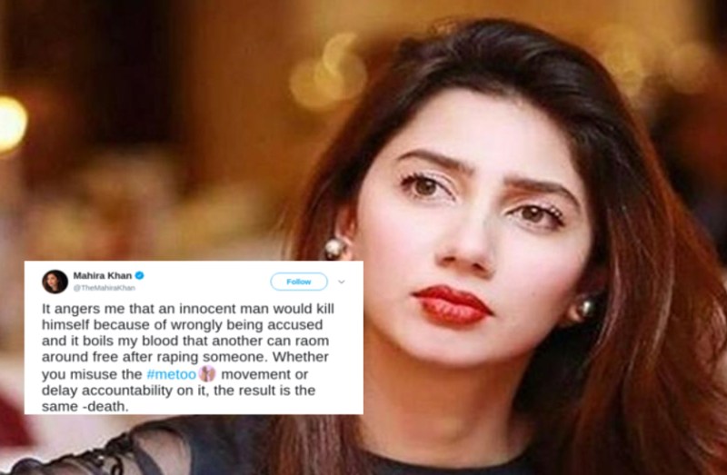 माहिरा ने ट्वीट कर लिखा, 'मुझे बहुत गुस्सा आता है कि उस मासूम शख्स ने अपनी जान दे दी और आत्महत्या कर ली क्योंकि उस पर एक महिला द्वारा छेड़छाड़ का गलत इल्जाम लगा था। मुझे बुरा इस बात का लगता है जो कुसूरवार हैं, जिन्होंने रेप किया है, वह आज भी खुलेआम घूम रहे हैं। गौर करें तो मूवमेंट के बाद भी मासूम लोगों की मौत तो हो ही रही है।'