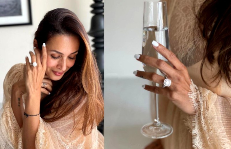 मुंबई। बॉलीवुड एक्ट्रेस मलाइका अरोड़ा सोशल मीडिया किसी न किसी वजह से छाई रहती हैं। कभी अपनी हॉट फोटोज और योग पोज को लेकर, तो कभी अभिनेता अर्जुन कपूर के साथ फोटोज के चलते। इस बार एक्ट्रेस ने इंस्टाग्राम पर दो फोटोज शेयर की हैं, जिनमें वह अंगूठी पहने नजर आ रही हैं।
