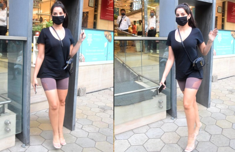 ब्लैक टीशर्ट और शॉटर्स में नोरा फतेही