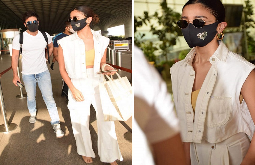 आज सुबह यानि सोमवार को आलिया और रणबीर को मुंबई एयरपोर्ट पर स्पॉट किया गया। इस दौरान दोनों मैचिंग कपड़े पहने नजर आए। आलिया ने व्हाइट जैकेट और पीले क्रॉप टॉप के साथ मैचिंग ट्राउजर पहना हुआ था। उनके ब्लैक मास्क के साथ ब्लैक सनग्लासेस लगाए हुए थे, जिसमें उनका लुक परफेक्ट लग रहा था। वहीं, रणबीर कपूर व्हाइट टी-शर्ट और डेनिम में नजर आए। दोनों की तस्वीरें सोशल मीडिया पर जमकर वायरल हो रही हैं।