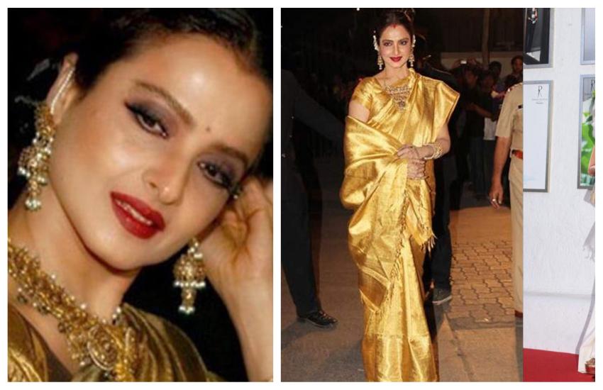 सफेद रंग की साड़ी में गोल्डन कलर के बॉर्डर से लिपटी रेखा काफी खूबसूरत नजर आ रही थी। इसके साथ उन्होंने फुल स्लीव ब्लाउज पहना है जिस पर गोल्डन बूटी का वर्क किया हुआ है। रेखा ने साड़ी से मैचिंग करती हुई ज्वैलरी, सिंदूर और बोल्ड रेड लिप्स्टिक लगाई हुई थी।