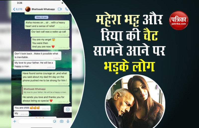 महेश भट्ट संग रिया चक्रवर्ती की चैट ( Mahesh Bhatt and Rhea Chakraborty Whatsapp Chat ) सामने आने से लोग सोशल मीडिया पर उनकी चैट को शेयर कर रहे हैं। यूजर्स का यह भी पूछना है कि यदि महेश भट्ट संग रिया की चैट सामने आई है तो सुशांत संग रिया की बातचीत फोन में मौजूद क्यों नहीं है? वहीं एक यूजर्स ने रिया को सुशांत का कातिल कहा है। साथ ही रिया पर अभिनेता की जिंदगी को नरक बनाने की बात भी कही है। सोशल मीडिया पर लगातार रिया और महेश के रिश्तों पर सवाल ( Raise Question On Rhea And Mahesh Relastionship ) उठाए जा रहे हैं।