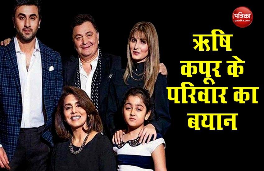 न्यूयॉर्क में अपने कैंसर का इलाज कराने के लगभग एक साल बाद सितंबर में ऋषि कपूर वापस इंडिया आए थे। ऋषि के निधन की खबर सुनने के बाद हर कोई गमगीन हैं, वहीं उनके परिवार की तरफ से एक बयान जारी किया गया है। ऋषि कपूर अंत समय में अस्पताल में कैसे रह रहे थे उन्होंने इसके बारे में बताया है और सभी लोगों से निवेदन भी किया है इस विषम परिस्थिति में सभी नियमों का पालन जरूर करें।