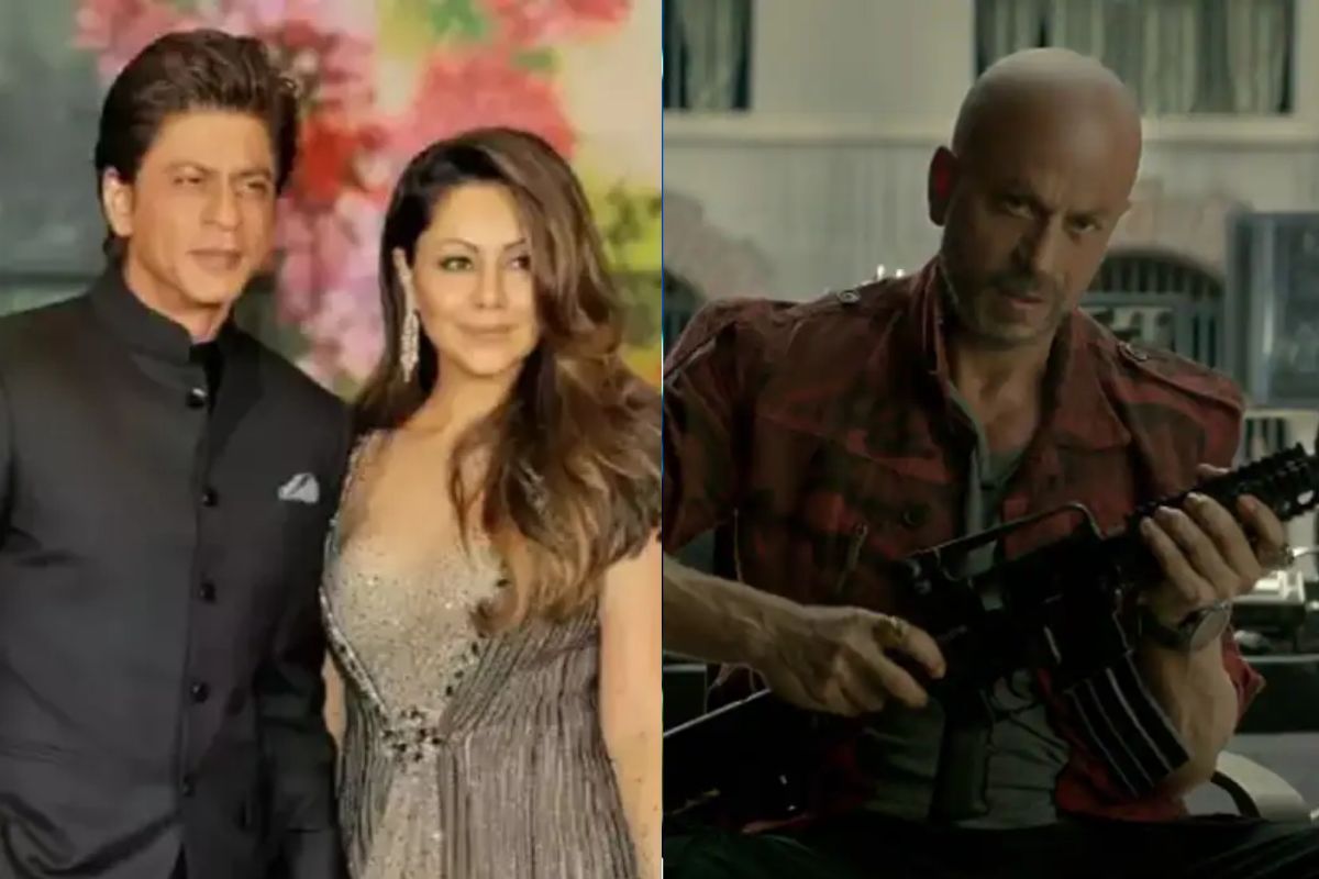 पत्नी गौरी खान के साथ शाहरुख खान(बांयें), दांये में जवान फिल्म के एक सीन में शाहरुख।