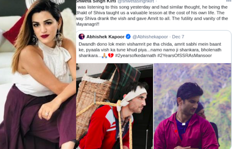 सुशांत सिंह राजपूत की फिल्म 'केदारनाथ' को रिलीज हुए दो साल बीतने पर फिल्म के डायरेक्टर अभिषेक कपूर ने एक ट्वीट किया और सुशांत को याद किया। सुशांत की बहन श्वेता ने अभिषेक के ट्वीट का स्क्रीनशॉट शेयर करते हुए अपने दिल की बात लिखी है। अभिषेक ने अपने ट्वीट में फिल्म के गाने नमो नमो की कुछ लाइनें शेयर की हैं।