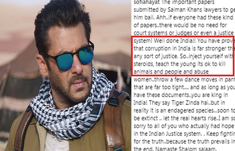 खबरों के मुताबिक एक्ट्रेस और एक्स बिग बॉस कंटेस्टेंट रह चुकी सोफिया हयात दबंग खान के जेल से बाहर निकलने पर काफी दुखी हैं। सोफिया ने इंस्टाग्राम पर सलमान के खिलाफ एक पोस्ट जारी किया। उन्होंने इंडियन करंसी की तस्वीर पोस्ट की और उसपर एक कैप्शन डाला। सोफिया ने लिखा,' इन जरूरी कागजातों को जमा करने के बाद सलमान को जमानत मिली है। अगर सबके पास इस तरह के पेपर हैं तो उन्हें कोर्ट जाने की कोई जरूरत नहीं है। सलमान ने इस बात को साबित कर दिया है कि हिंदुस्तान में न्याय से ज्यादा भ्रष्टाचार फैला हुआ है। अंत में उन्होंने लिखा कि,' जो लोग भारतीय कानून पर भरोसा करते हैं मुझे उनसे सहानुभूति है।'