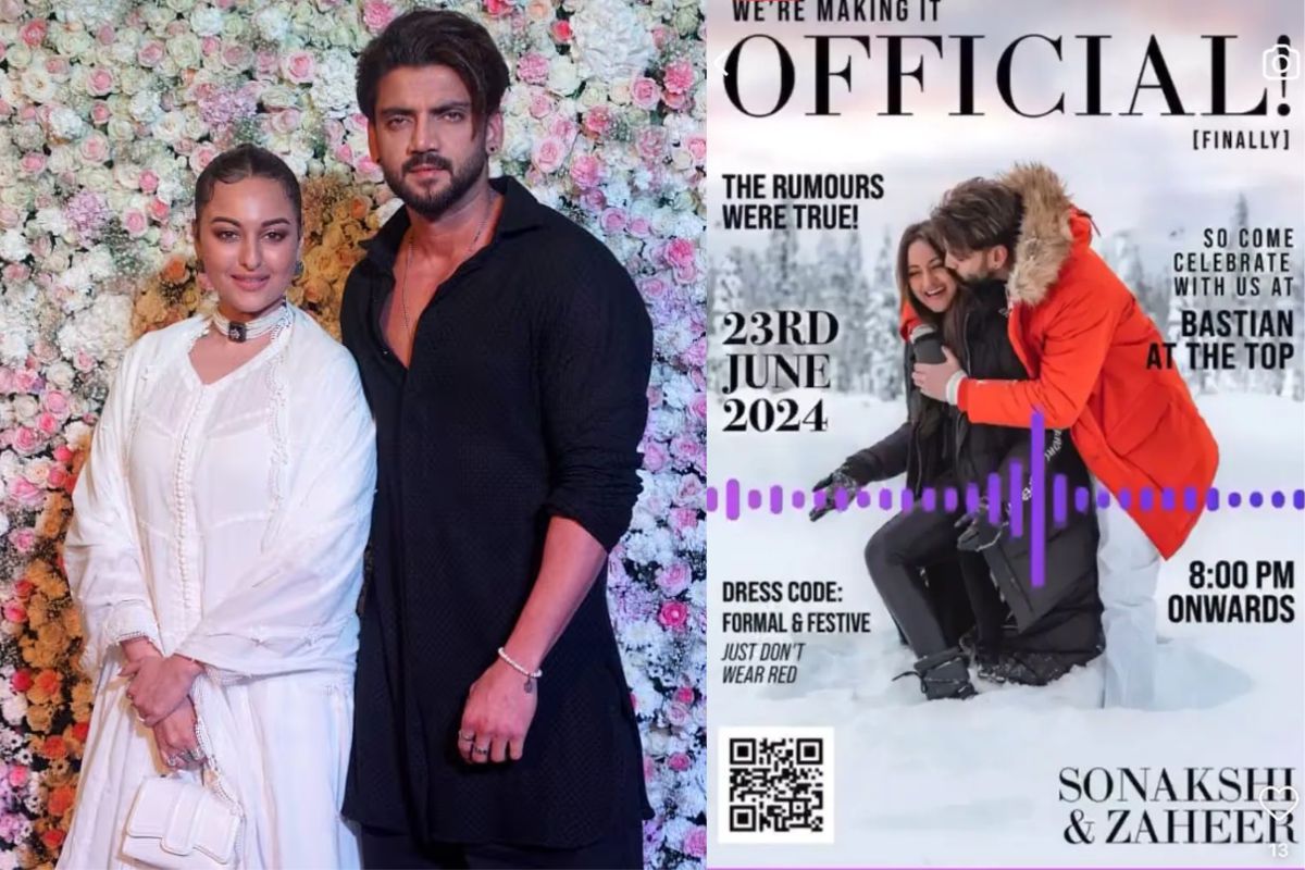 सोनाक्षी सिन्हा और जहीर इकबाल का जो ऑडियो वेडिंग कार्ड वायरल हो रहा है उसके मुताबिक, दोनों 23 जून को ही शादी के बंधन में बंधने जा रहे हैं, इसके लिए दोनों बहुत ज्यादा एक्साइटेड हैं। शादी के इस कार्ड में एक ऑडियो क्यूआर कोड भी शामिल है, जिसमें सोनाक्षी और जहीर का एक प्यारा मैसेज भी है। लीक हुए कार्ड पर लिखा हुआ है। 'अफवाहें सच थी...'