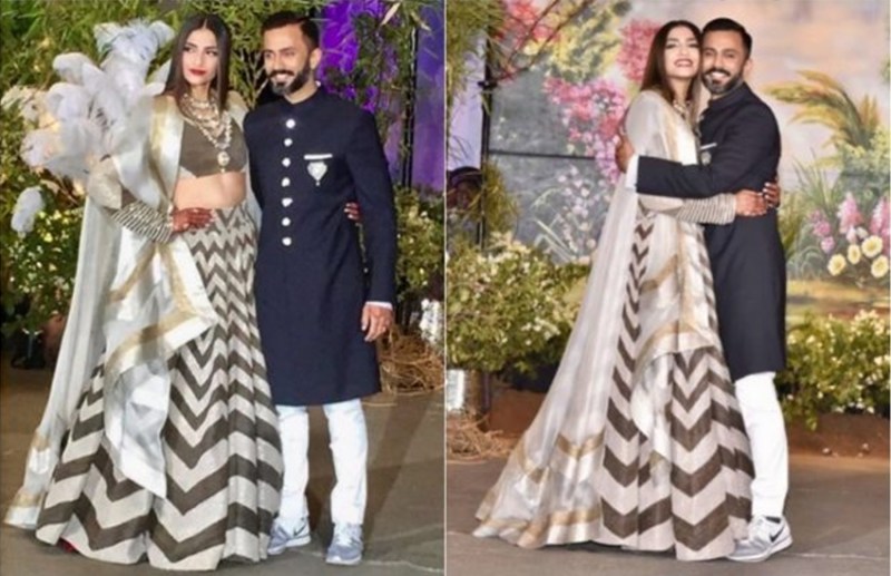 जहां शादी में सोनम ने लाल रंग का खूबसूरत लहंगा पहना था वहीं रिसेप्शन पर्टी में सोनम ने मेहंदी कलर की डिजाइनर ड्रेस पहनी हुई थी। वहीं आनंद आहूजा ब्लैक कलर की शेरवानी में नजर आए।