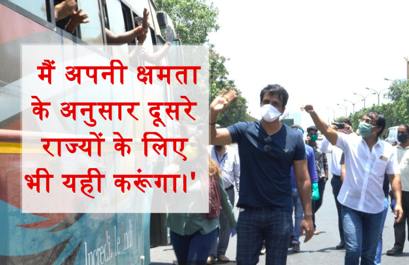 इस बारे में सोनू ने कहा, 'मेरा मानना है कि वर्तमान समय में जब हम सभी इस वैश्विक स्वास्थ्य आपदा का सामना कर रहे हैं, प्रत्येक भारतीय अपने परिवारों और प्रियजनों के साथ रहना चाहता है। मैंने महाराष्ट्र और कर्नाटक सरकारों से इन प्रवासियों को लगभग 10 बसों से घर पहुंचाने की अनुमति ली। मेरे लिए छोटे बच्चों और बूढ़े माता-पिता सहित सड़कों पर घूमने वाले इन प्रवासियों को देखना बहुत ही भावुक कर देने वाला था। मैं अपनी क्षमता के अनुसार दूसरे राज्यों के लिए भी यही करूंगा।'