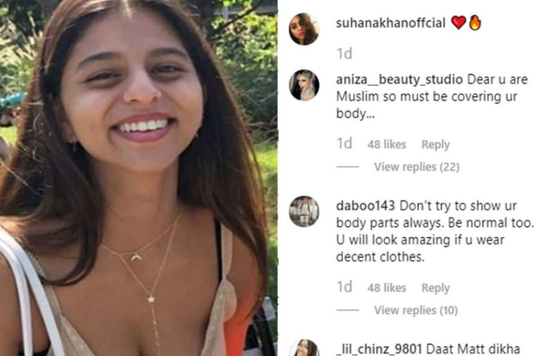 सुहाना इन तस्वीरों में काफी प्यारी दिख रही हैं लेकिन कुछ लोगों ने उनकी तस्वीरों को लेकर ट्रोल कर दिया है और उनके बारे में अमर्यादित भाषा इस्तेमाल की है। कुछ इंटरनेट यूजर्स ने सुहाना को कपड़े ठीक से पहनने की सलाह दी है और उनके कपड़ों के चुनाव पर नाराजगी जताई है वहीं कुछ लोगों ने सुहाना का बचाव भी किया है। सुहाना ने न्यूड कलर में डीप नेक स्पैगेटी और ब्लैक पैंट्स पहन रखे हैं और स्माइल करते हुए वह काफी प्यारी नजर आ रही हैं।