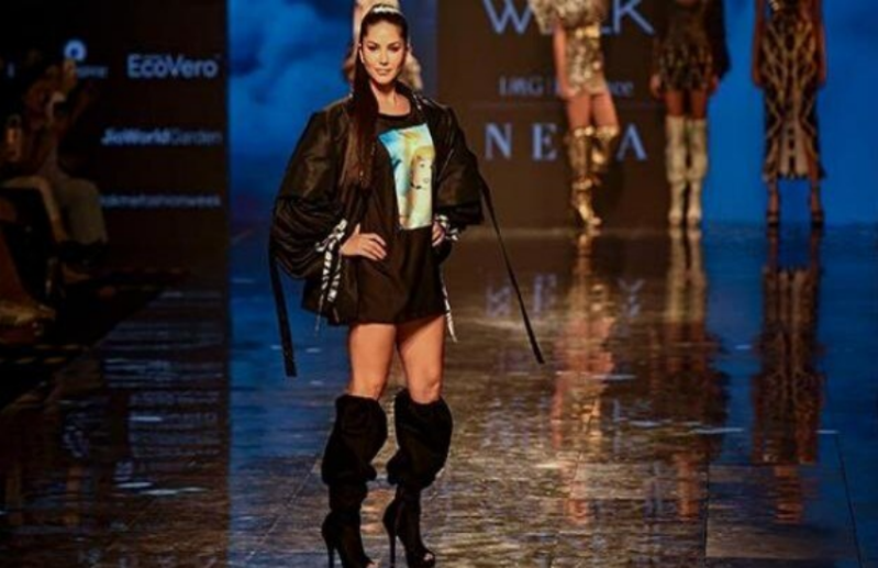 रैंप वॉक करती हई सनी लियोन लैक प्रिंटेड टीशर्ट और ब्लैक जैकेट पहन जमकर जलवा बिखेरा।