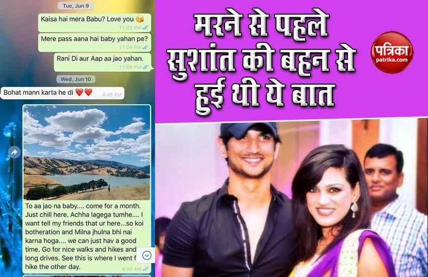 सुशांत ने अपनी बहन को यह मैसेज 9 जून को किया था जिसमें लिखा था, कैसे है मेरा बाबू, लव यू, मेरे पास आना है बेबी यहां पे ? रानी दी और आप आ जाओ यहां।'' वहीं 10 जून को सुशांत ने करीब सुबह 4 बजकर 45 मिनट पर इसका जवाब देते हुए लिखा, ''बहुत मन करता है दी।'' इसके जवाब में श्वेता ने एक मैसेज में कहा कि वो वहां उनके पास चले जाएं।