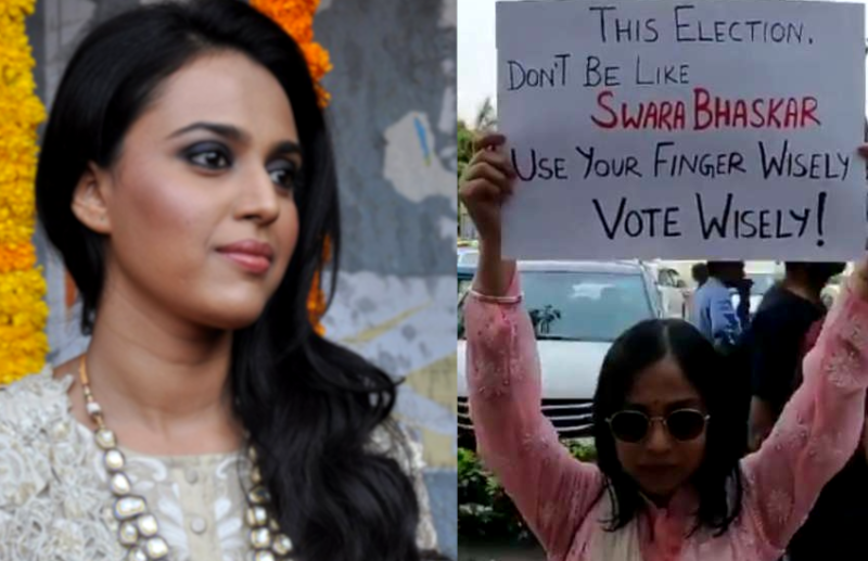 लोकसभा चुनाव के दौरान मुंबई में वोटिंग डे पर दो लोगों ने स्वरा भास्कर की मूवी 'वीरे दी वेडिंग' के एक सीन को लेकर वोट अपील की। ये एक 'प्लेसकार्ड' लिए हुए थे। इस पर लिखा था, 'इस चुनाव में स्वरा भास्कर की तरह ना करें। अपनी उंगली का इस्तेमाल समझदारी से करें। समझदारी से वोट करें।' हाथों में 'प्लेसकार्ड' लिए इनकी पोस्ट देखते ही देखते वायरल हो गई।