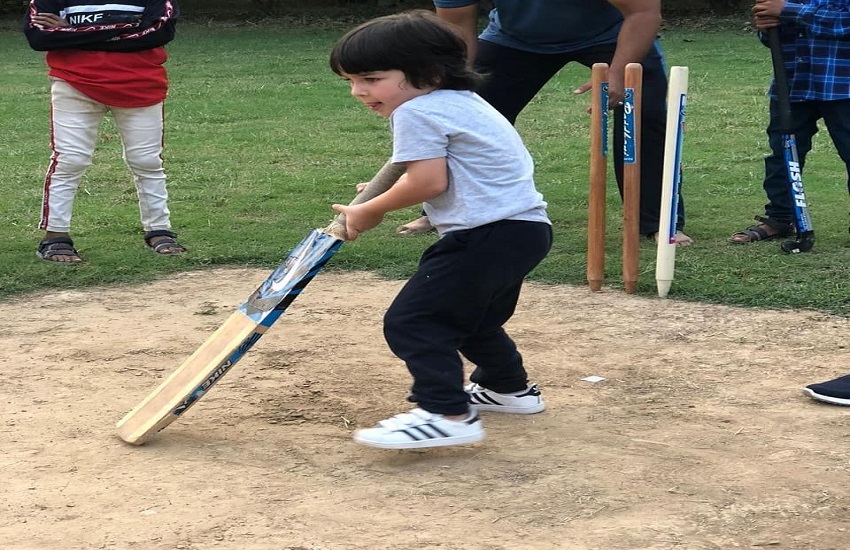 Taimur Ali Khan with bat on cricket ground