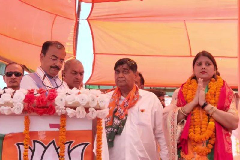 डिप्टी सीएम केशव मौर्य के साथ कांग्रेस से आए सत्यशेखर और भाजपा प्रत्याशी नैना गुप्ता।