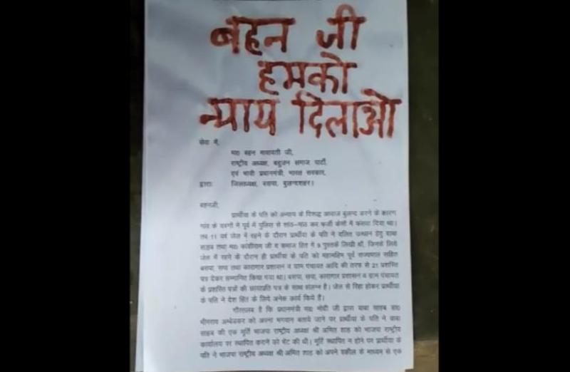 बुलंदशहर। देश में चुनावी माहौल है लेकिन उससे पहले एक दलित परिवार ने बसपा सुप्रीमो मायावती को खून से खत लिखकर न्याय की गुहार लगाई है। महिला ने आरोप लगाया है कि बीजेपी विधायक के शय पर कुछ दबंग उन्हें परेशान कर रहे हैं और झूठे मुकदमे में फंसाने की धमकी दे रहे हैं। इसलिए महिला ने कलेक्ट्रेट पहुंच कर मदद की गुहार लगाई।