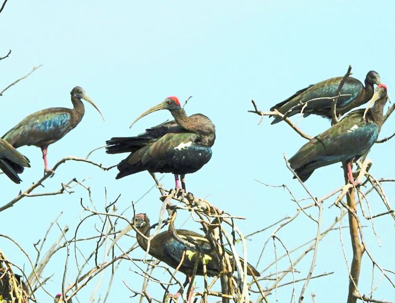 गुढ़ानाथावतान में सफेदे के पेड़ पर बैठा लाल सिर आइबिस का एक समूह