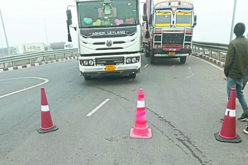 बडाखेडा. दिल्ली मुंबई एक्सप्रेस वे के लबान इंटरचेज से बैरिकैड्स तोडकर गुजरते वाहन।