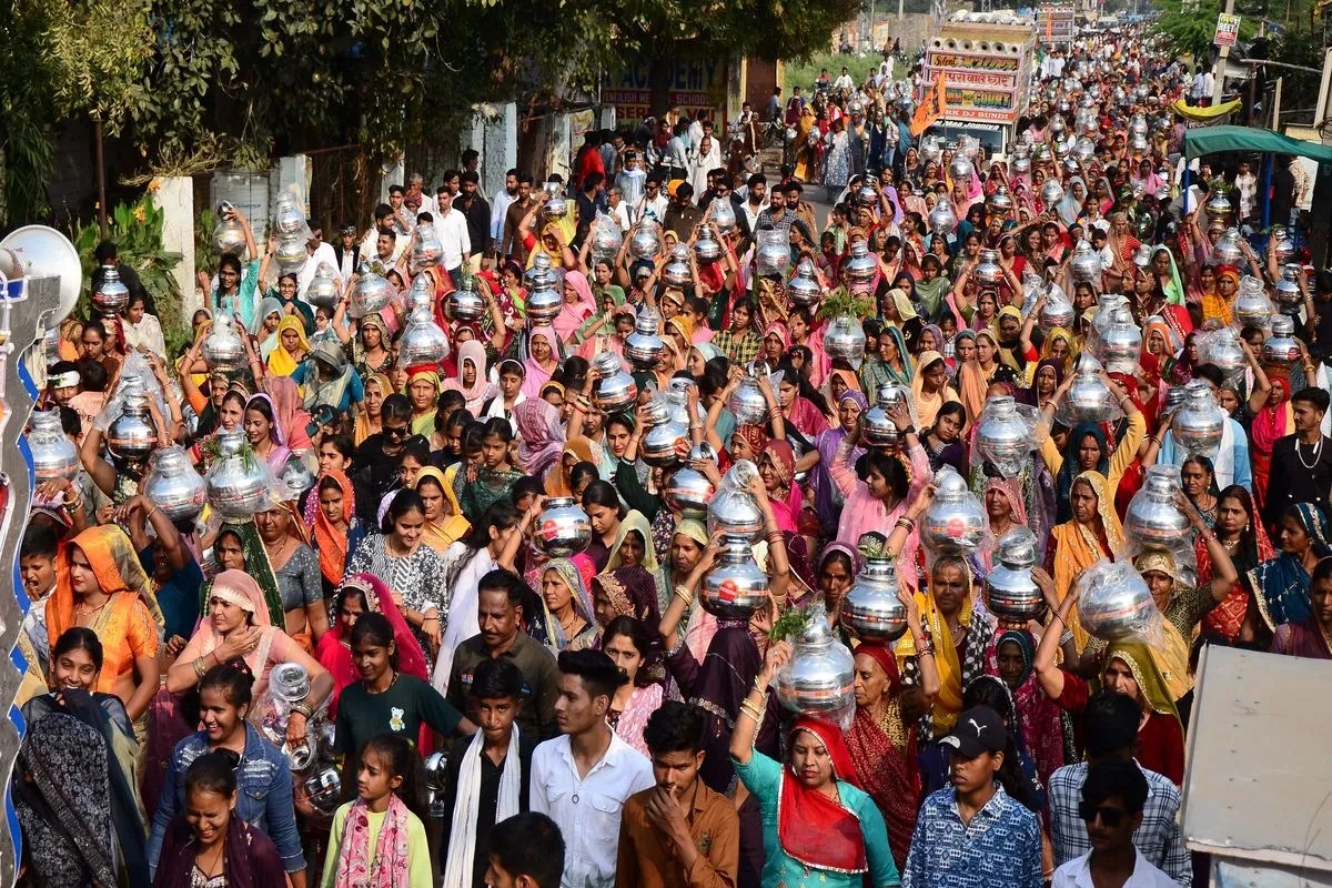 समाज की 2500 महिलाओं ने सिर पर कलश धारण किए। जगह-जगह पुष्पवर्षा कर कलश यात्रा का स्वागत किया गया। सुबह गीता भवन में महामंडलेश्वर जगदीश पुरी के सानिध्य में मीणा समाज जिलाध्यक्ष रामेश्वर मीणा (छरकवाड़ा), पूर्व जिलाध्यक्ष रामेश्वर मीणा (लाडपुर), आनंदीलाल मीणा, मनोज मीणा सहित समाज के पदाधिकारियों ने पूजा-अर्चना की।