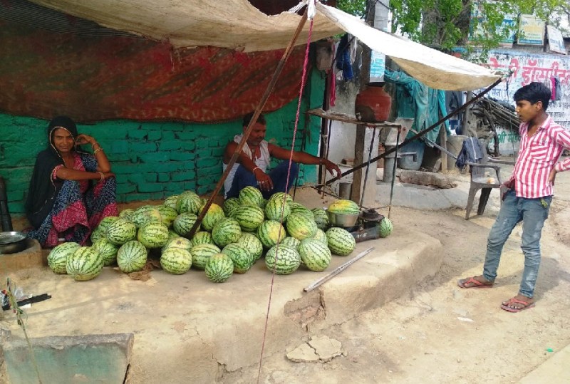 तौलाबाई ने बताया कि तरबूज बेचने से रोज सौ पचास रुपए की कमाई हो जाती है। आगे मकान निर्माण के काम चलेंगे तो औजार की धार बनाने का काम चलेगा। इसी उम्मीद में तरबूज बेचने का धंधा कर समय पास कर रहे हैं।