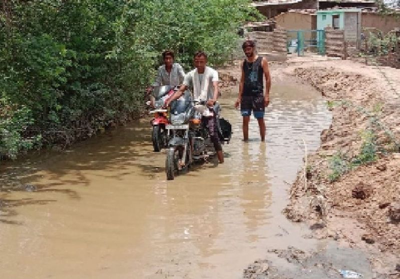 सड़क पर दोनों रास्तों में करीब चालीस फीट तक इतना पानी भरा हुआ है। जैसे कोई नदी या तालाब हो। बाइक चालक फिसल जाते हैं और उनके कपड़े खराब हो जाते हैं। पैदल गुजरने वालों को पानी से होकर गुजरना पड़ रहा है।