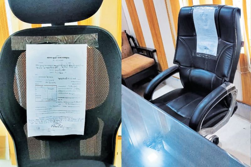 नगर पालिका अध्यक्ष व अधिशासी अधिकारी की कुर्सी कुर्क करने के बाद कुर्सी पर चिपकाया नोटिस (फोटो: पत्रिका)
