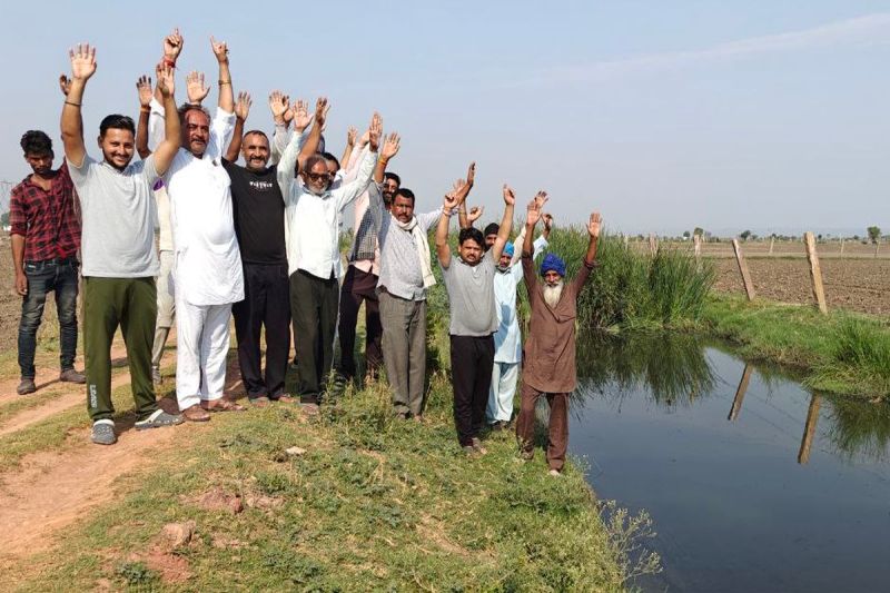रामगंजबालाजी सिवरेज ट्रीटमेंट प्लांट से ड्रेन में दूषित पानी को लेकर सरपंच के साथ प्रदर्शन करते किसान।