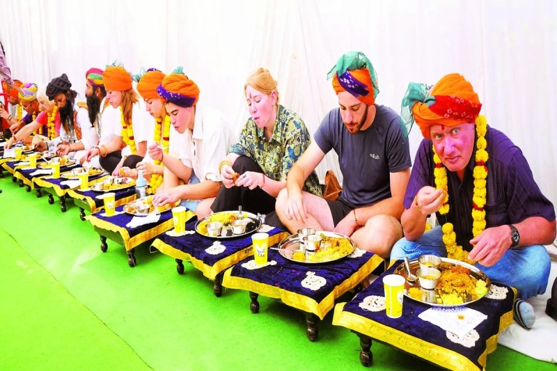 बूंदी के सुखमहल में आयोजित मान मनुहार कार्यक्रम के दौरान राजस्थानी भोजन करते विदेशी सैलानी।