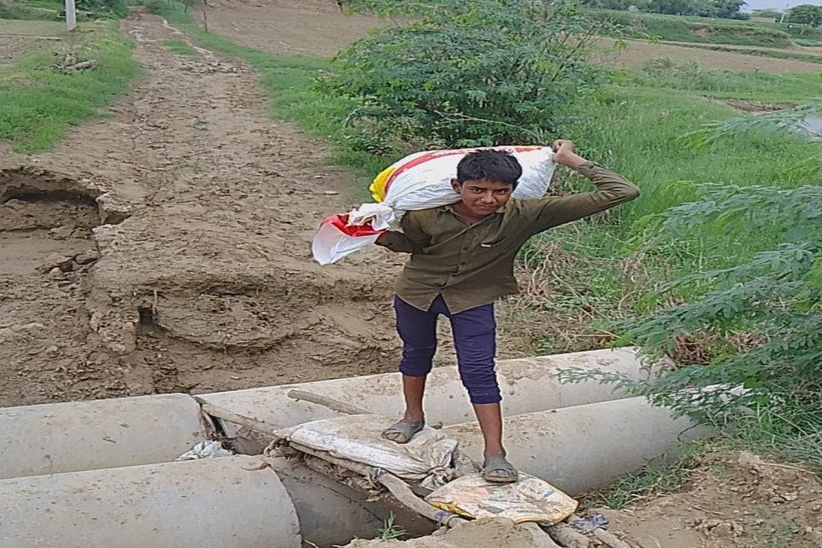 रामगंजबालाजी. जर्जर सड़क से गुजरता बालक।