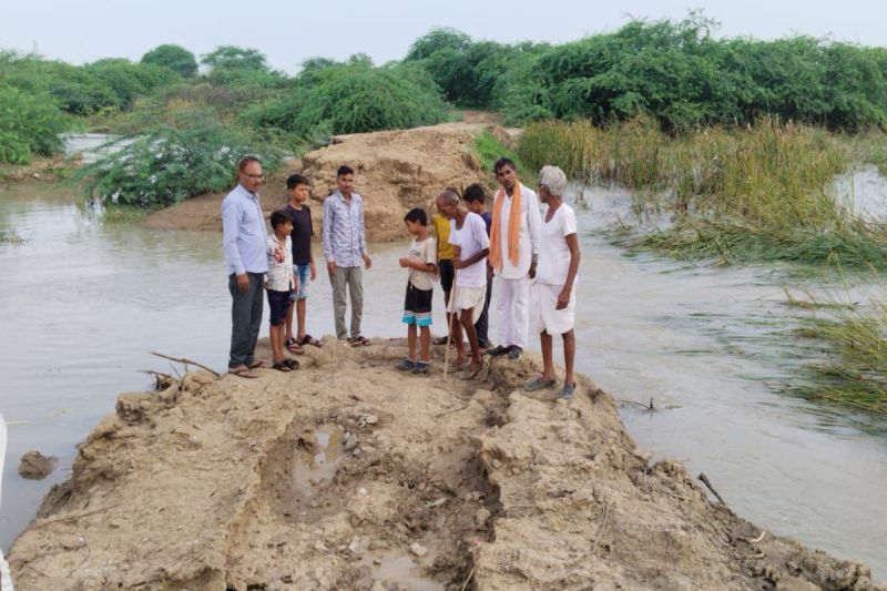 नोताडा.बरसात के कारण खाळ में उफान से लक्ष्मीपुरा गांव के निकट पुलीया के समीप कटे रास्ते को दिखाते ग्रामीण।