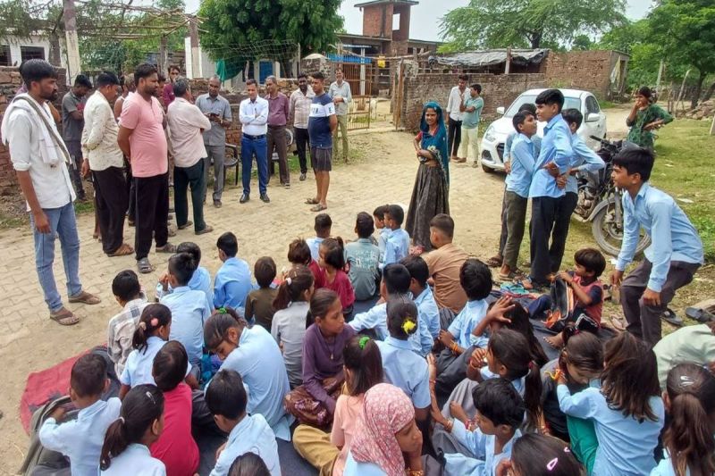 देई. क्षेत्र की चीता की झौंपडियां गांव राजकीय उच्च प्राथमिक विद्यालय पर तालाबंदी कर विरोध प्रदर्शन करते ग्रामीणों से समझाइस करते शिक्षा विभाग के अधिकारी।