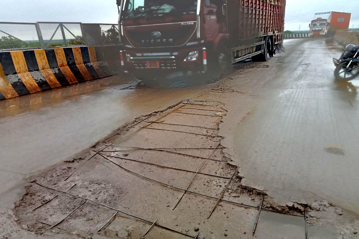लबान. क्षेत्र में दिल्ली मुंबई रेलवे मार्ग पर कोटा दौसा मेगा हाइवे पर पापड़ी गांव के समीप बना ओवर ब्रिज छह माह में ही क्षतिग्रस्त हो चुका हो गया है। रेल लाइन के ऊपर बनी सीसी में गड्ढे होने ब्रिज की सतह से लोहे के सरिया बाहर आ गए हैं। वहीं डामर भी उखड़ कर गड्ढों में तब्दील हो गया है।