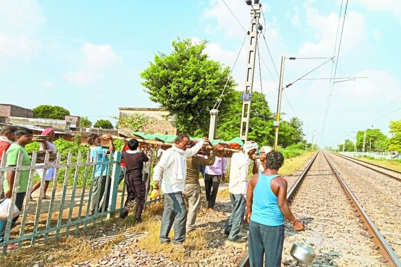 लबान देईखेड़ा कस्बे में रास्ते के अभाव में शवयात्रा को रेल की पटरियों को पार करते परिजन