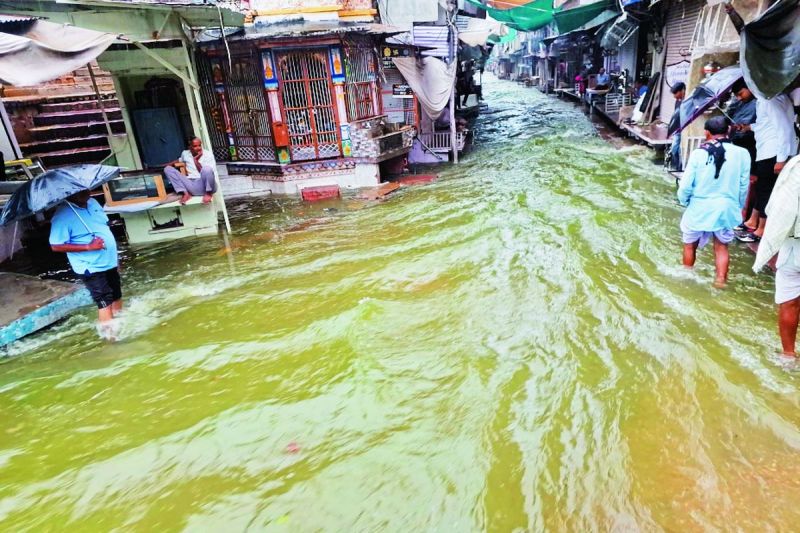 बूंदी. नवलसागर के गेट खोलने के बाद बाजार में बहता पानी।