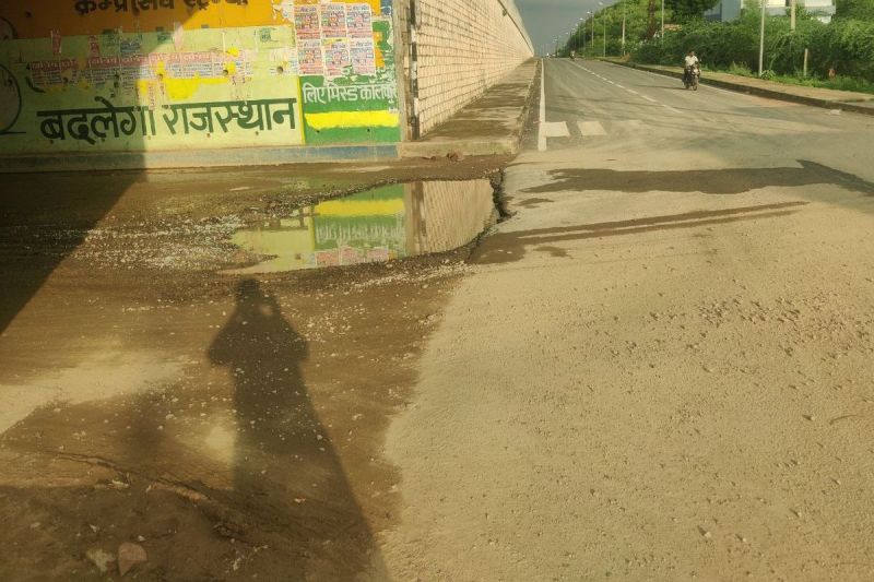हिण्डोली सिंघाडी रोड अंडरपास पर हो रहे गढ्ढे में भरा पानी।